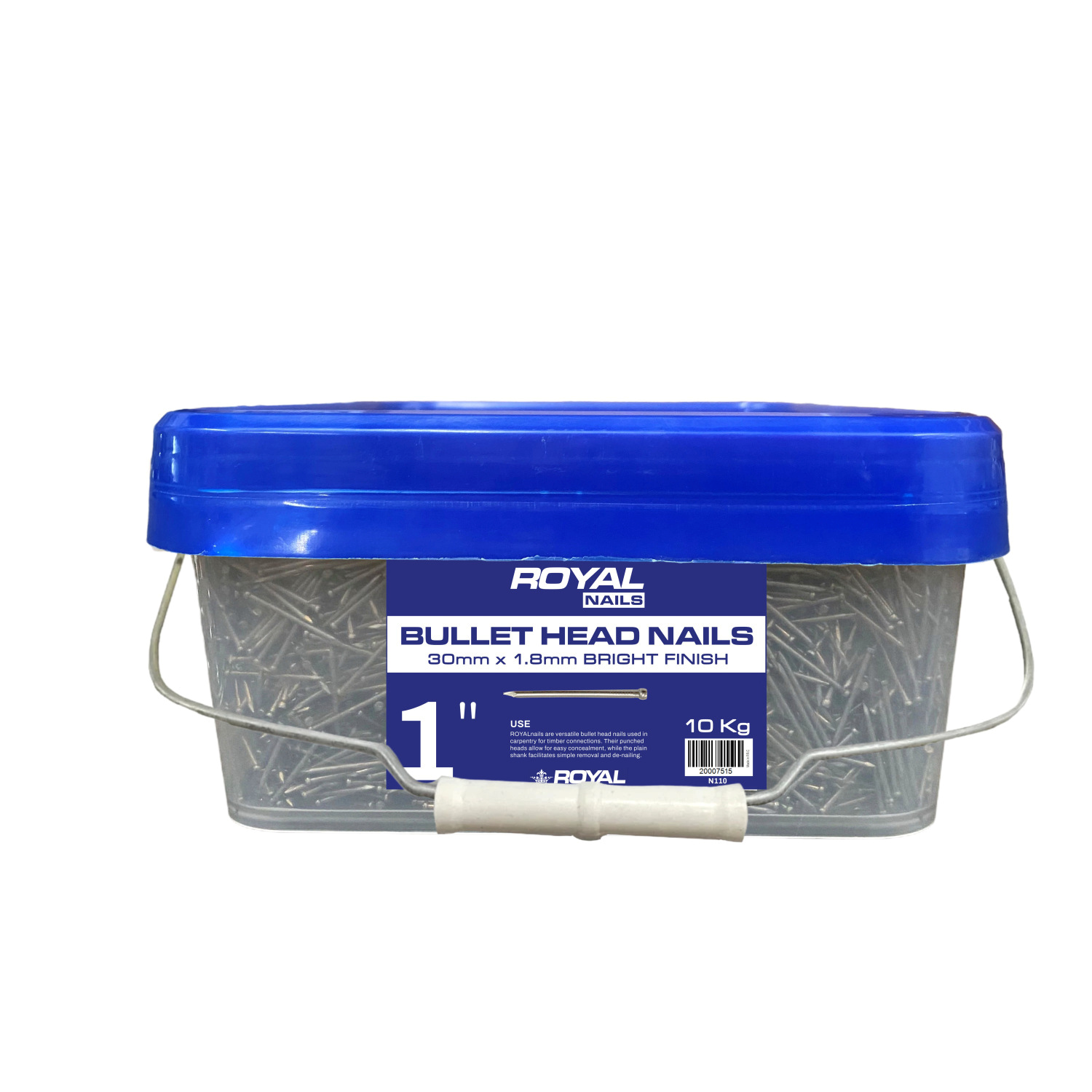 ROYAL 30 x 1.8mm bullet head nails deliver a clean, punchable finish ideal for trim, light framing, and general carpentry. The small head allows filling for a neat surface. Suitable for interior use in softwood and hardwood. Supplied in a 10kg box for extended productivity on site. Manufactured to ensure consistent driving, reduced bending, and strong holding power across typical fit-out and finishing applications.