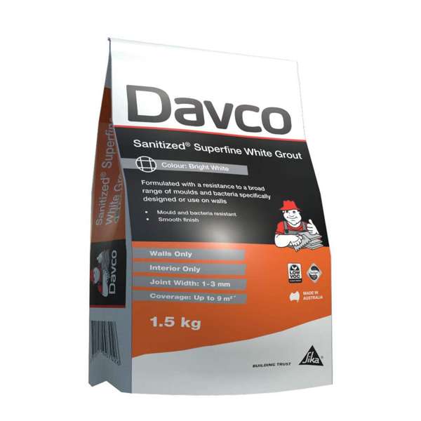 Davco Sanitized Superfine Tile Grout in White delivers a smooth, fine finish ideal for narrow joints on walls and floors. The mould-resistant Sanitized formulation helps inhibit algae and mildew growth, keeping grout lines cleaner for longer in wet areas. Easy to mix and apply, it provides excellent workability and a consistent colour finish. Suitable for ceramic and porcelain tiles in bathrooms, kitchens, and living areas. Use indoors or outdoors where a refined, durable grout line is required.