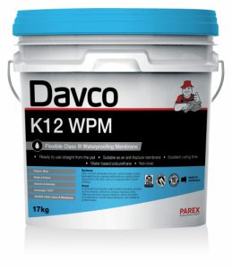 Davco K12 17kg is a high-build waterproofing membrane for wet areas, balconies, and external substrates. Provides robust water resistance with good flexibility and crack-bridging. Suitable under tiles and compatible finishes after curing. Easy application with roller or brush. Designed for professional waterproofing where dependable barrier performance is essential. Observe specified dry times and system requirements.