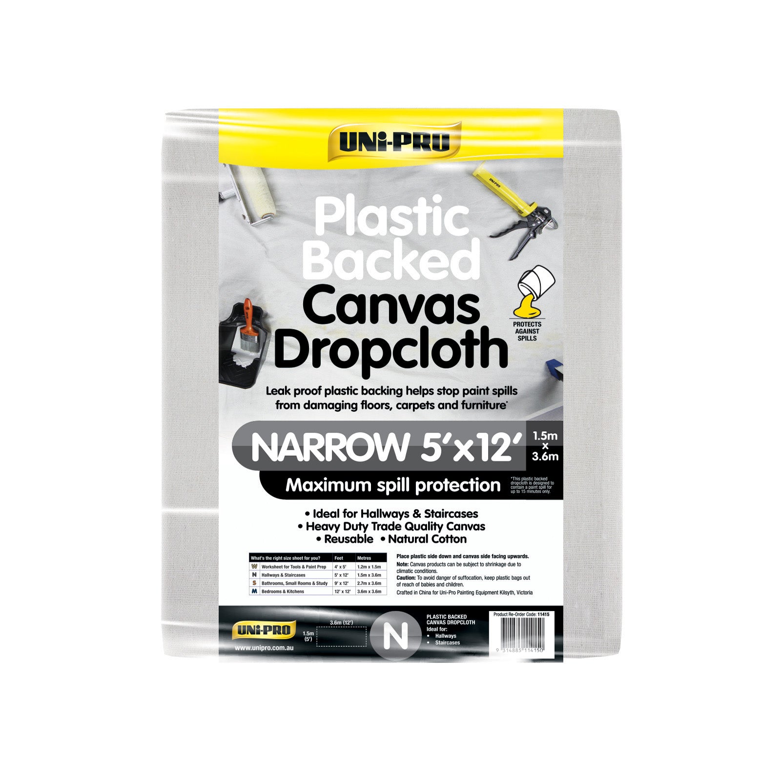 The Uni-Pro 5ft x 12ft heavy duty canvas drop cloth provides robust protection for floors and furniture along walls and corridors. Tough and reusable, it resists slips and tears during painting and prep work. Easy to position and fold, it keeps job sites clean and professional. Ideal for DIY and trade applications requiring dependable, reusable surface protection.